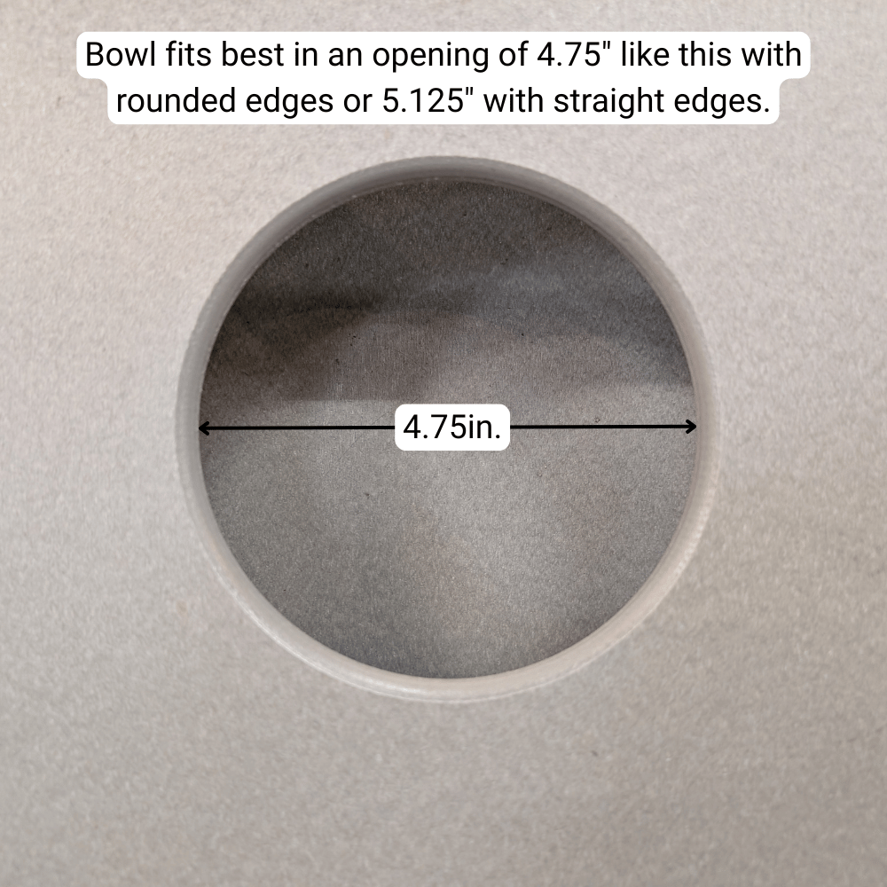 The bowl is 5.375" in diameter and 1.125" tall, and fits best in an opening of 4.75" with rounded edges or 5.125" with straight edges.