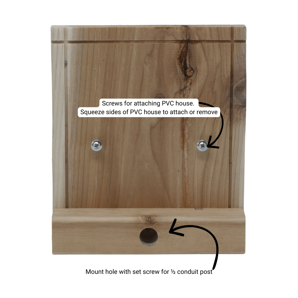 Unit price perThe Sparrow-Resistant Gilbertson Bluebird House gives your birds a safe place to nest. Based on the trusted Gilbertson design, it features a slotted entrance that lets in sunlight—something sparrows don’t like. This prevents male sparrows from trapping female bluebirds inside. The natural cedar roof adds a classic look while helping shed water, and the house is crafted with durable PVC for long-lasting use. It mounts easily on 1/2" conduit and house pops off quickly for cleaning. Whether you're just starting out or replacing an old house, the Sparrow-Resistant Gilbertson Bluebird House is an easy, low-maintenance way to protect your bluebirds and enjoy a more peaceful backyard.