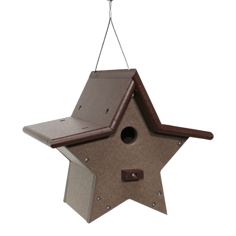 Bring a touch of charm to your backyard with the Star Shaped Wren or Chickadee House, beautifully crafted to stand out while offering a cozy nesting spot for small birds. Designed with a 1.125" entrance hole, it’s the perfect size for wrens, chickadees, and other petite songbirds.