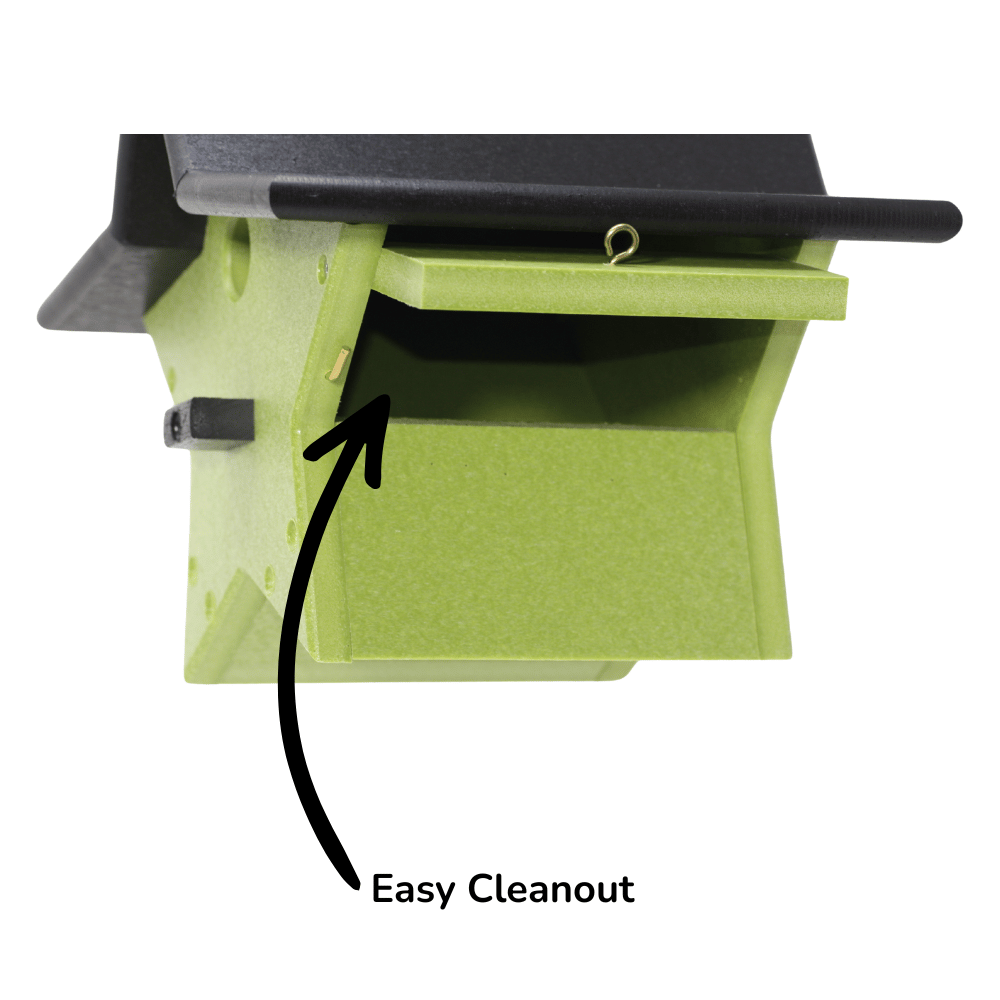 Made from eco-friendly poly lumber—crafted from recycled materials—it won’t rot, crack, or fade, ensuring years of enjoyment and worry-free maintenance. A side clean-out panel makes seasonal cleaning quick and easy, while the sturdy hanging design allows you to place it anywhere birds love to gather.