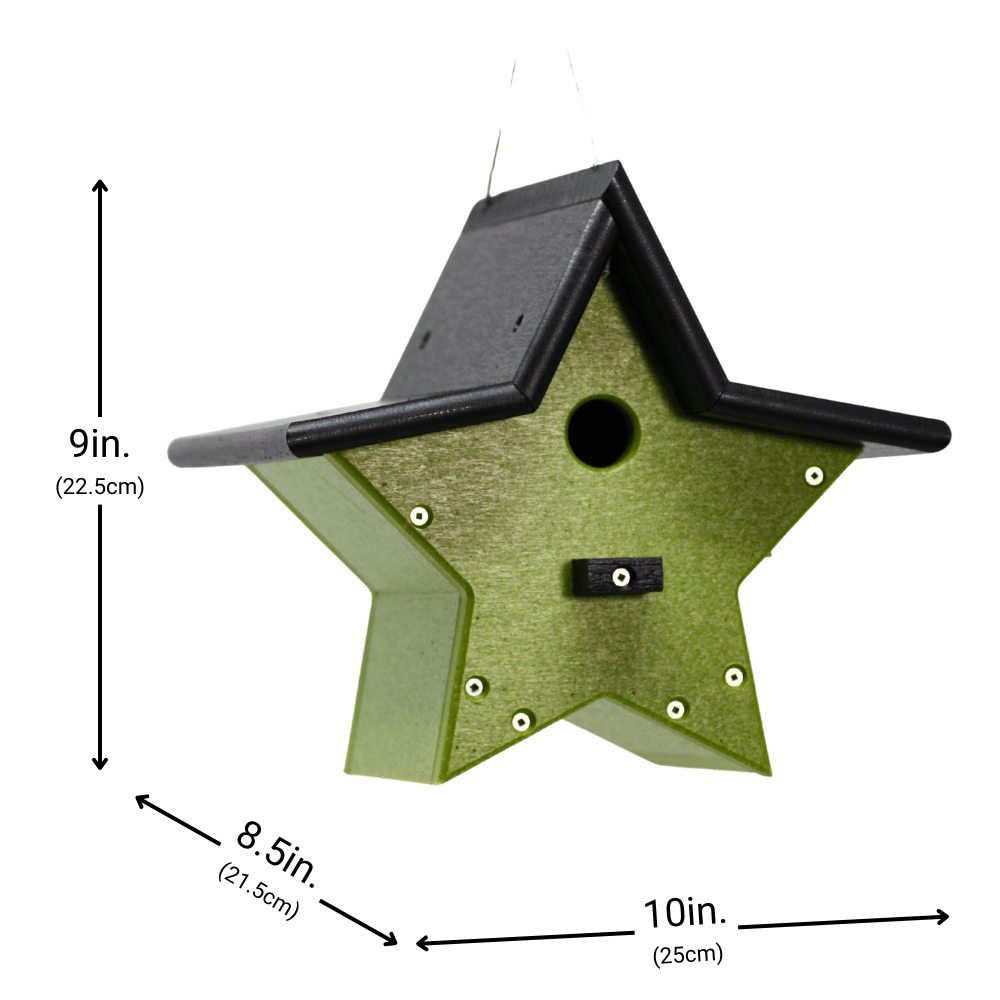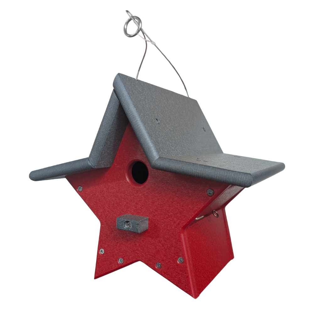 Unit price perBring a touch of charm to your backyard with the Star Shaped Wren or Chickadee House, beautifully crafted to stand out while offering a cozy nesting spot for small birds. Designed with a 1.125" entrance hole, it’s the perfect size for wrens, chickadees, and other petite songbirds.