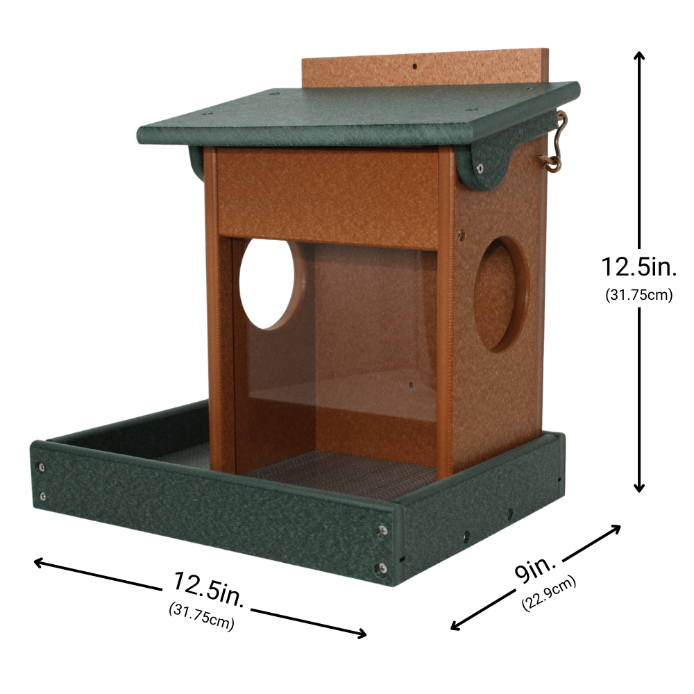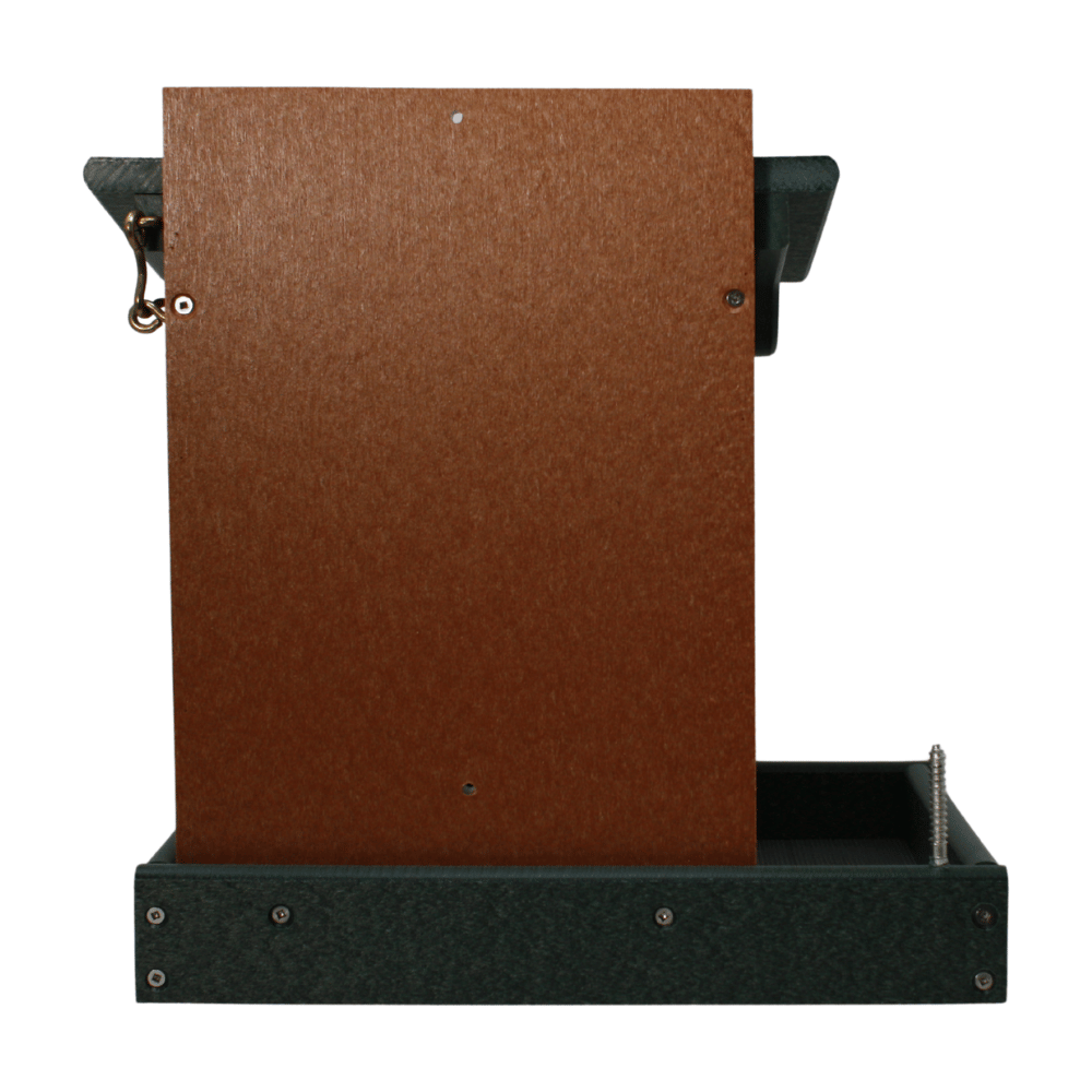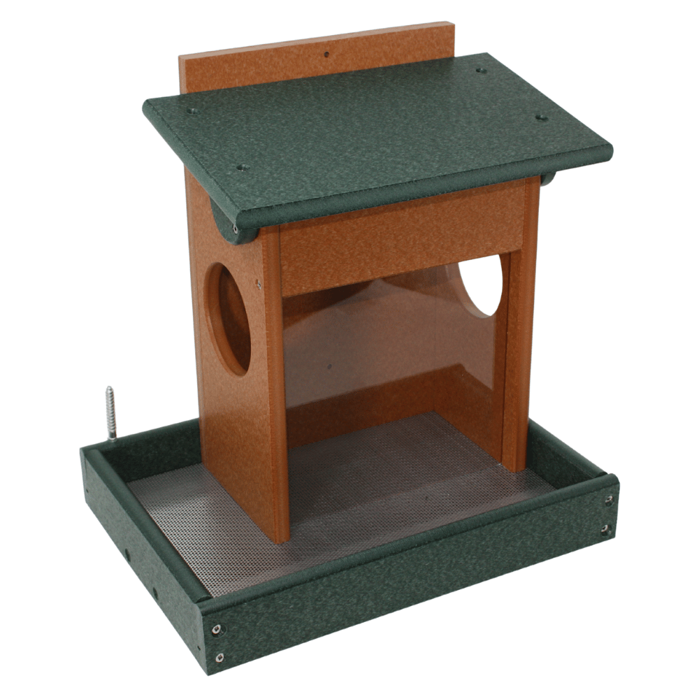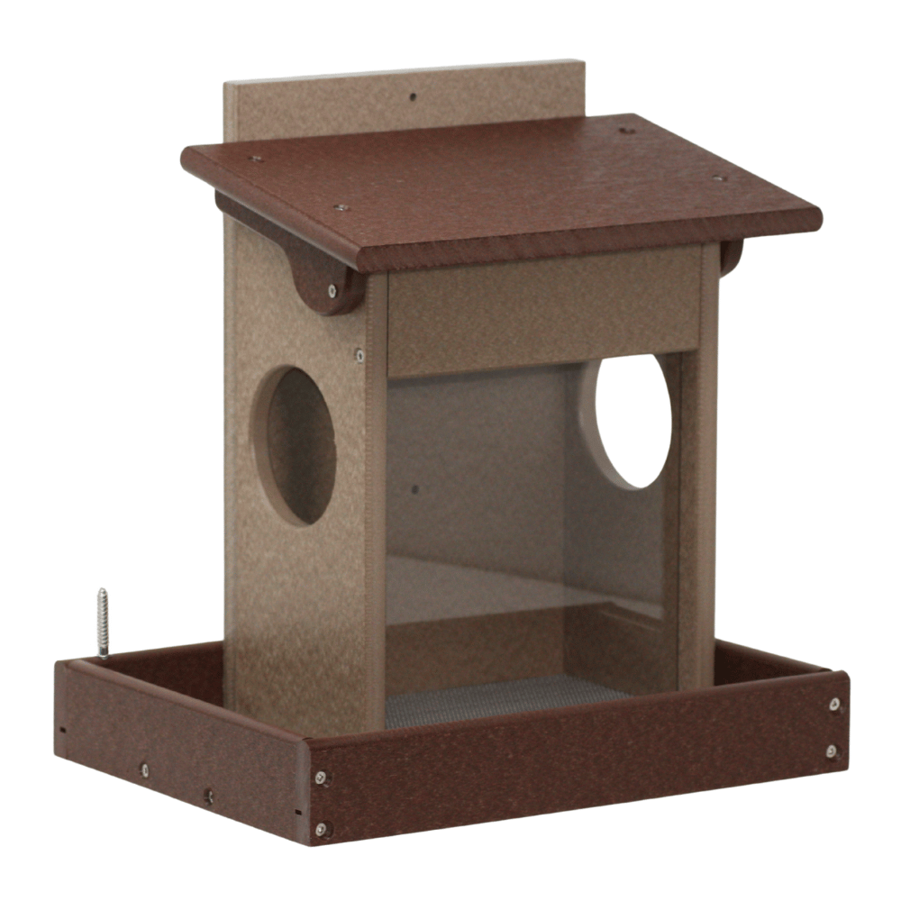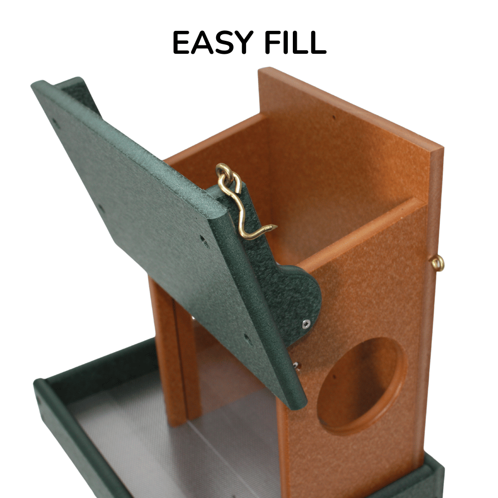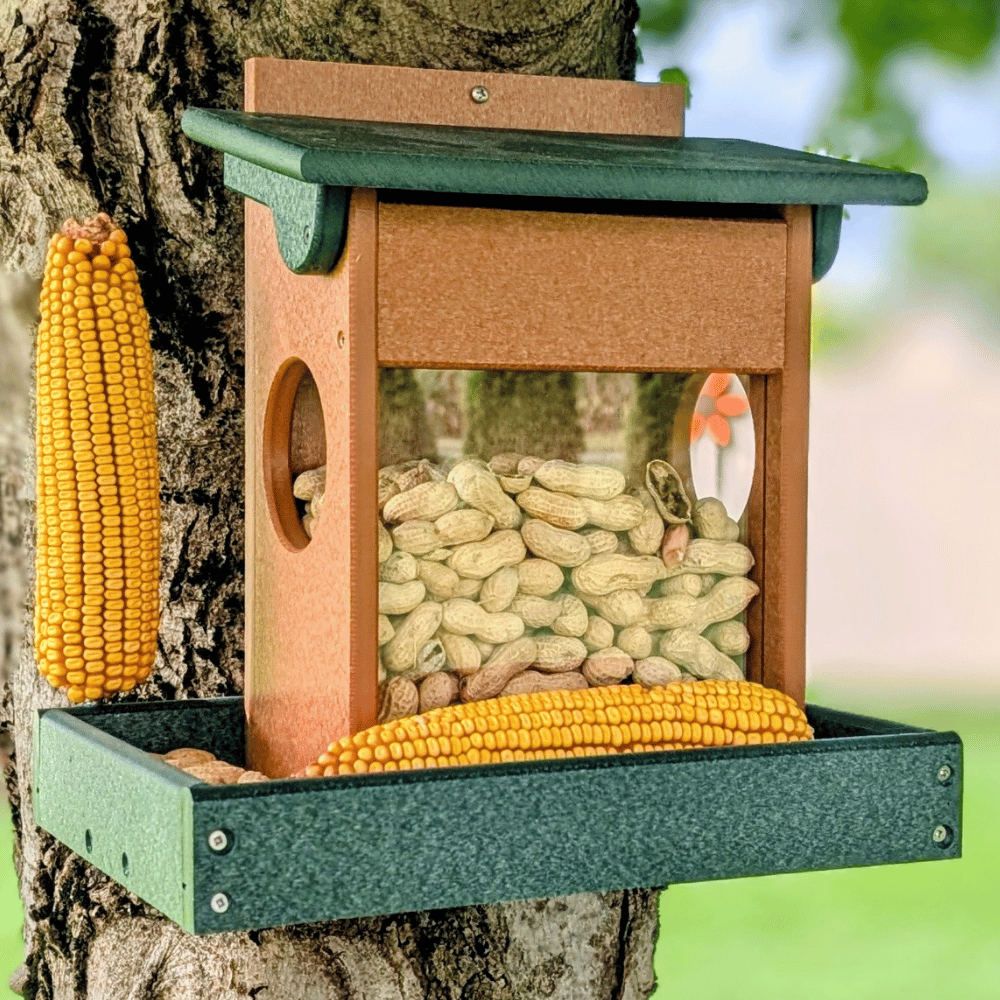 Give your squirrels their own feeding station with the Corn & Peanut Squirrel Feeder. Designed to hold both corn and peanuts at the same time, it keeps your backyard visitors busy and away from your bird feeders. Handcrafted from eco-friendly poly lumber, this feeder won’t fade, crack, or rot—offering durability that lasts through every season. Easy to fill and clean, it provides a fun and functional way to enjoy watching squirrels in action. Built strong for daily use, this feeder is a reliable choice for any wildlife-friendly backyard.
